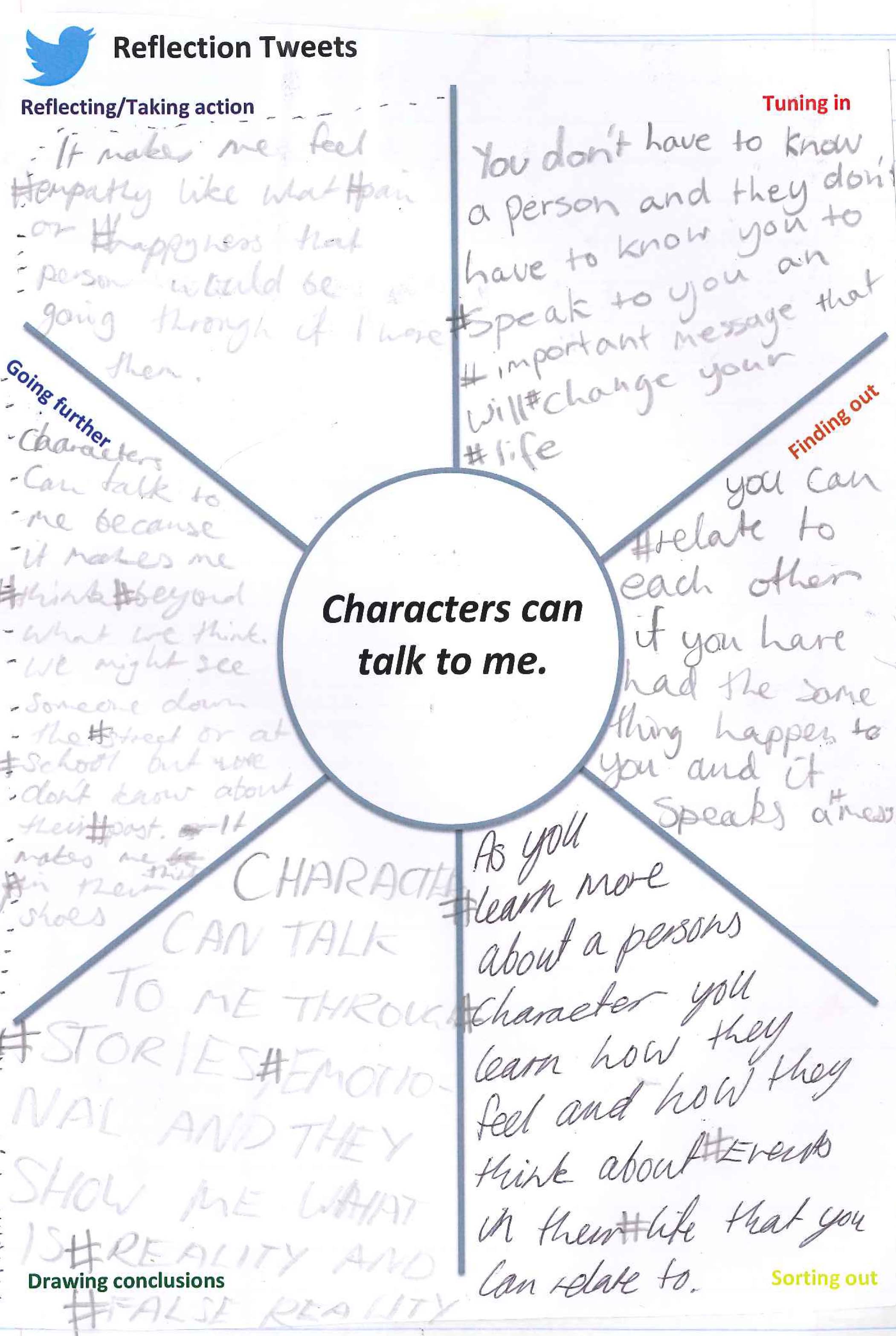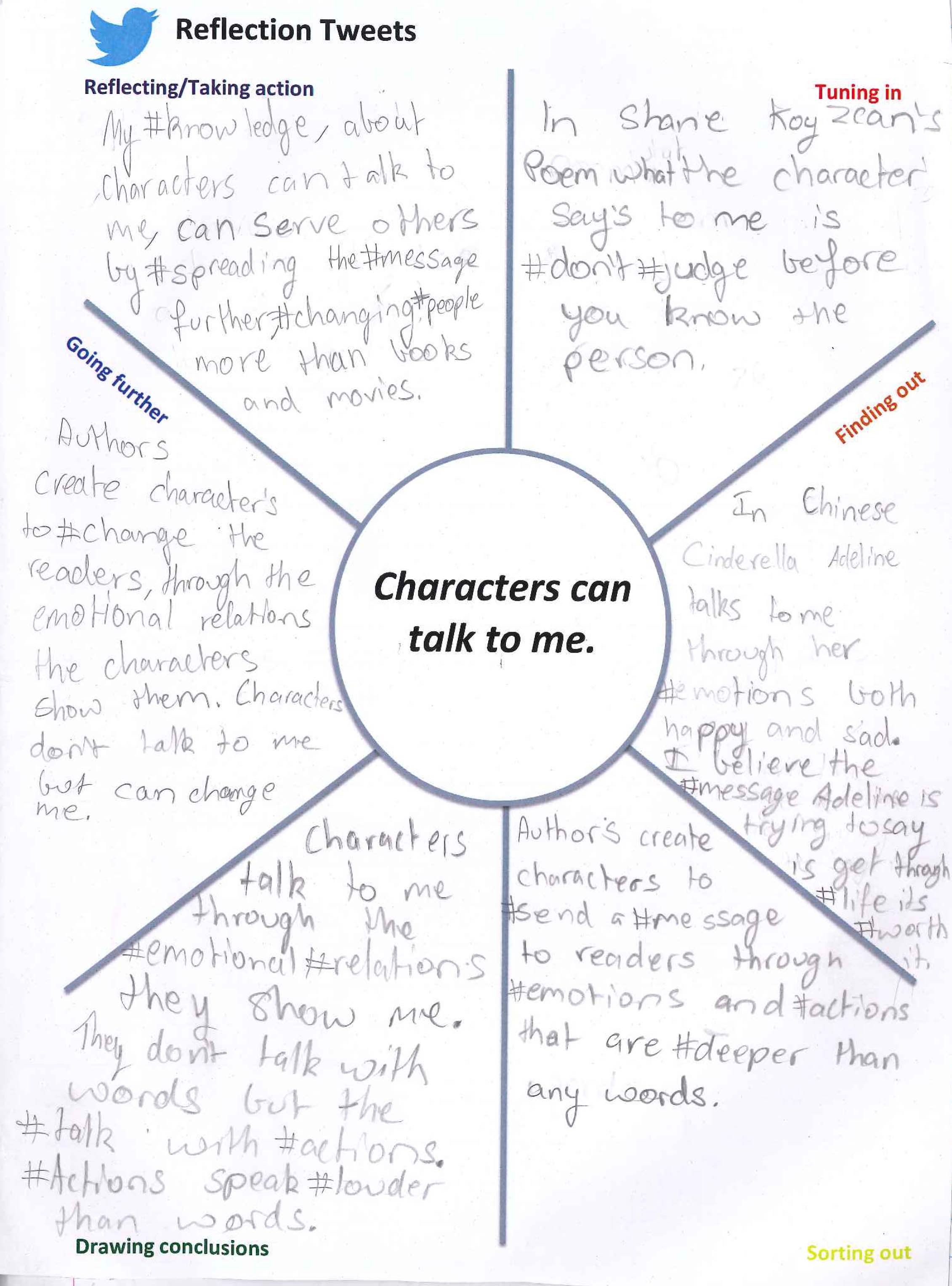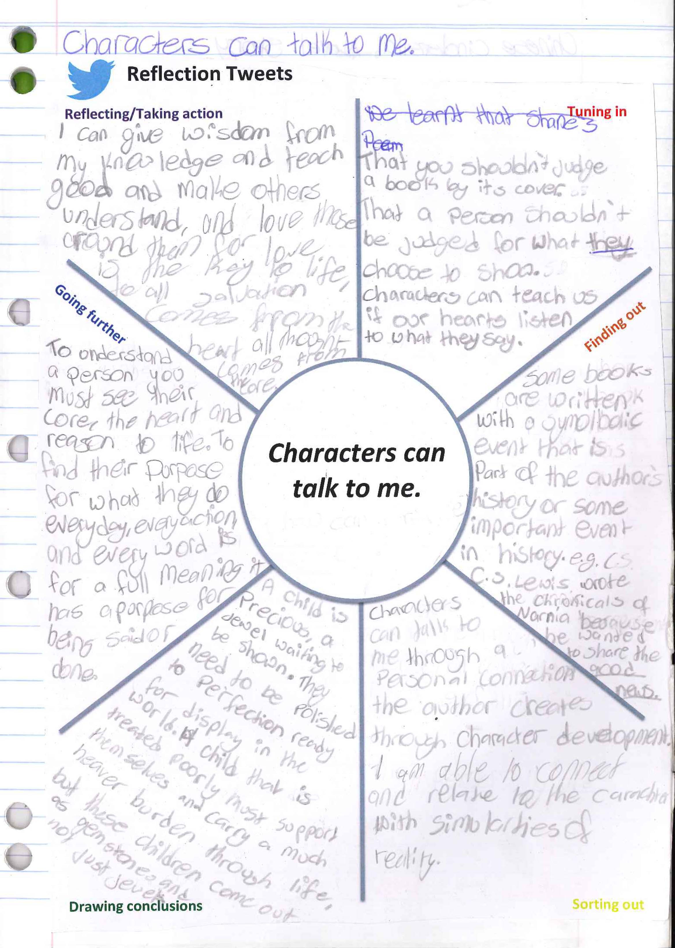 This reflection is simply one page in the students Language and literature books where they can jot down 140 character “tweets” in response to our SOI. Our Language and literature unit has been an inquiry into the authors craft, how authors develop characters with intention to change the perspective of the audience. Our SOI is very simple: characters can talk to me. We go deeper through our inquiry questions, global context area of exploration and learning experiences into the key and related concepts of development, character and audience imperative.