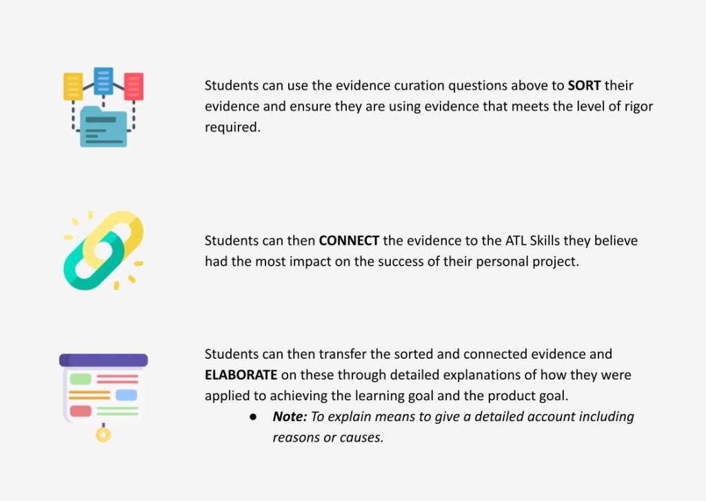 - Have I selected evidence that shows my ability to independently transfer knowledge gathered in my pursuit of the learning goal and the ATL skills I have selected to the creation of my product goal?